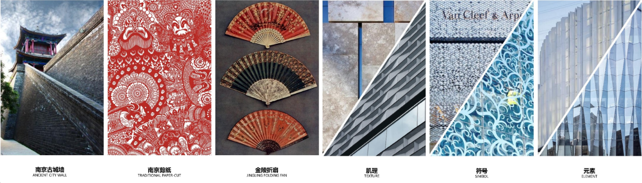 承继南京文化及历史腔调,ABC地块商业立面精心提炼南京古城墙砖、南京剪纸、金陵折扇等南京标志性文化与建筑元素,充分融入建筑细节设计及色彩搭配。