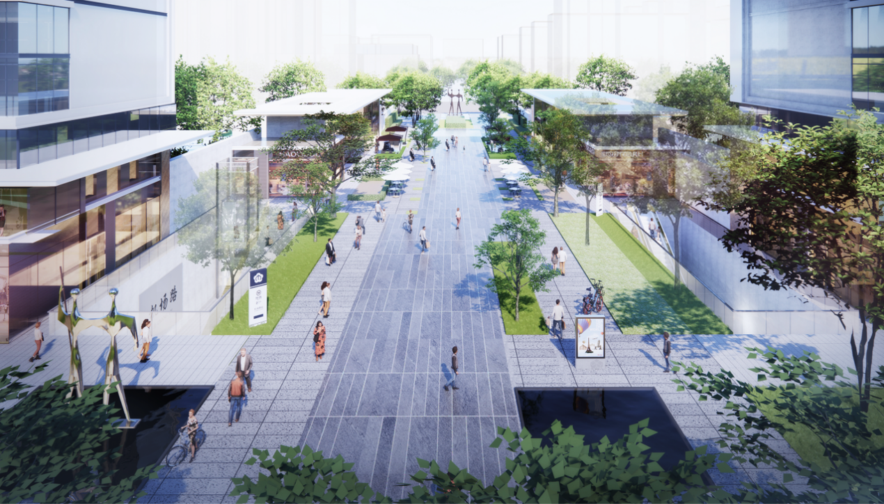 大校场核心区采用了密路网+“特色街巷”的创新模式,将文化艺术、时尚潮流与自然景观融为一体。金陵华夏中心的创新型特色街巷,将区别于传统街道,带来更为自由美好的生活方式,两条特色街巷串联起南北7个分区,结合机场跑道公园区域级多功能公共空间的定位,两者之间形成开放互动的关系,共同构筑一个混合多元、开放包容的城市空间。