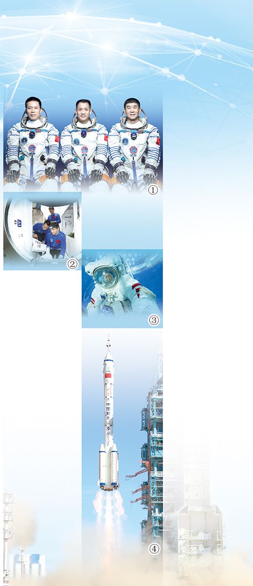 图①:执行“神十二”任务的航天员合影,从左至右依次为汤洪波、聂海胜、刘伯明。图②:航天员在核心舱模拟器内训练。图③:聂海胜在进行水下训练。图④:6月17日上午,搭载神舟十二号载人飞船的长征二号F遥十二运载火箭腾空而起。 本文图片 人民日报