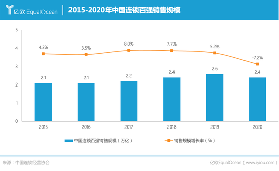 中国连锁经营协会“2020年行业基本情况及连锁百强调查”结果显示,2020年连锁百强销售规模2.4万亿元,比2019年下降了7.2%;其中52家百强企业销售同比下降,降幅达15.4%。这是自统计以来整体销售首次出现负增长,在一定程度上表明零售业陷入了增长瓶颈期。