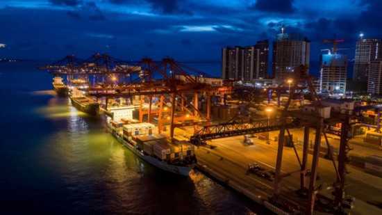 资料图:6月10日,夜幕降临,忙碌的海口港。图片来源:视觉中国 新华网发