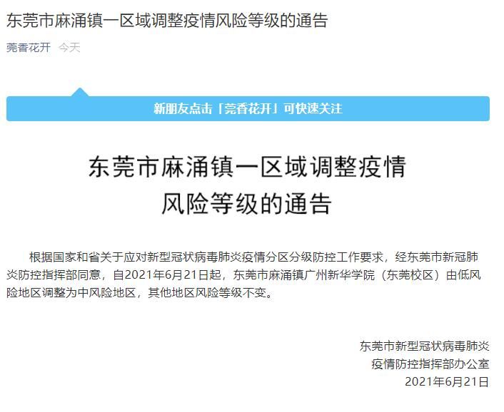 荔枝新闻讯 据“莞香花开”微信公号消息,根据国家和省关于应对新型冠状病毒肺炎疫情分区分级防控工作要求,经东莞市新冠肺炎防控指挥部同意,自2021年6月21日起,东莞市麻涌镇广州新华学院(东莞校区)由低风险地区调整为中风险地区,其他地区风险等级不变。
