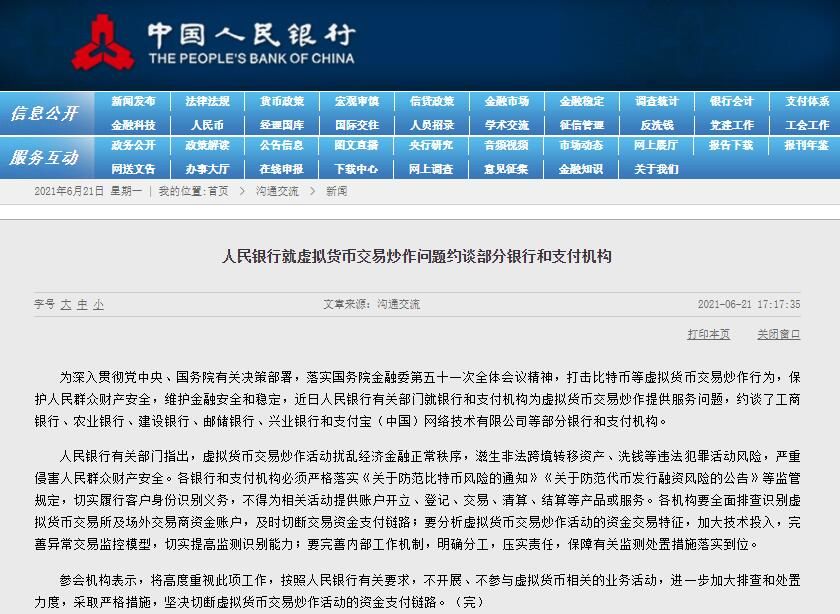 为深入贯彻党中央、国务院有关决策部署,落实国务院金融委第五十一次全体会议精神,打击比特币等虚拟货币交易炒作行为,保护人民群众财产安全,维护金融安全和稳定,近日人民银行有关部门就银行和支付机构为虚拟货币交易炒作提供服务问题,约谈了工商银行、农业银行、建设银行、邮储银行、兴业银行和支付宝(中国)网络技术有限公司等部分银行和支付机构。