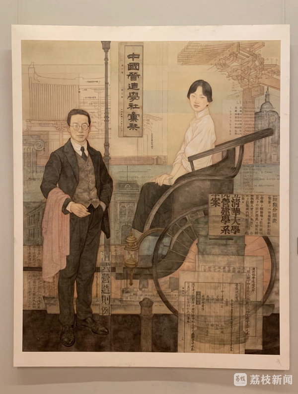 南京特殊教育师范学院美术与设计学院青年教师黄荣波创作的《梁思成与林徽因》,入选第13届全国美展进京作品,“历时大约有半年左右,在作品当中呈现出来的背景里面的一个构成要素,就是两个人的一个共同成长经历,这些元素是这种经纬网的构成方式,共同编织在整个人物的背景当中,形成了一个横向和纵向的点线面交织。既有工笔的成分,又有写意的成分,这是我的一个阶段性的成果。”黄荣波说。