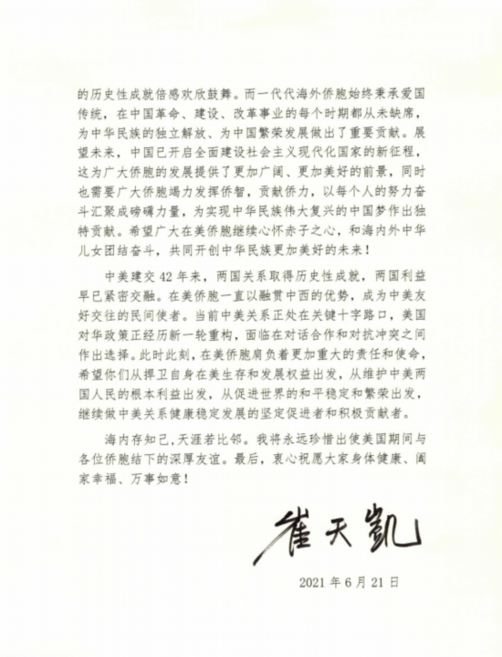 海内存知己,天涯若比邻。我将永远珍惜出使美国期间与各位侨胞结下的深厚友谊。最后,衷心祝愿大家身体健康、阖家幸福、万事如意!