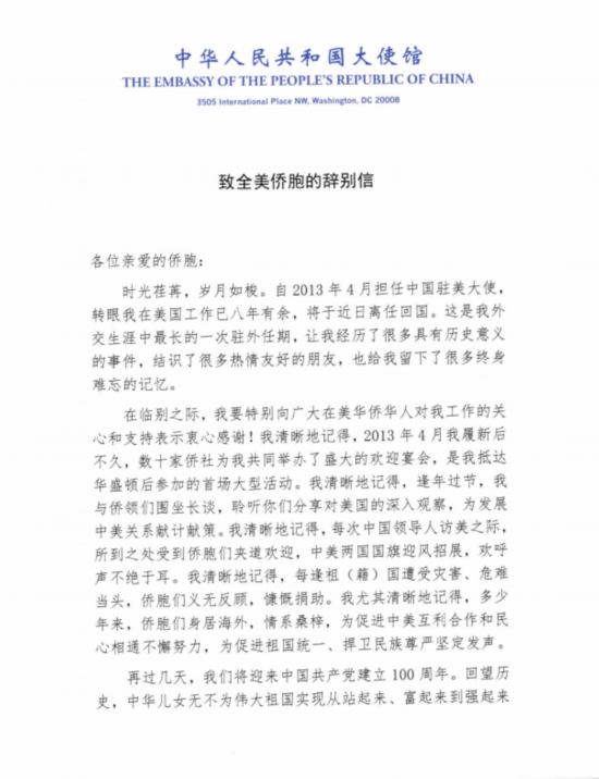 在临别之际,我要特别向广大在美华侨华人对我工作的关心和支持表示衷心感谢!我清晰地记得,2013年4月我履新后不久,数十家侨社为我共同举办了盛大的欢迎宴会,是我抵达华盛顿后参加的首场大型活动。我清晰地记得,逢年过节,我与侨领们围坐长谈,聆听你们分享对美国的深入观察,为发展中美关系献计献策。我清晰地记得,每次中国领导人访美之际,所到之处受到侨胞们夹道欢迎,中美两国国旗迎风招展,欢呼声不绝于耳。我清晰地记得,每逢祖(籍)国遭受灾害、危难当头,侨胞们义无反顾,慷慨捐助。我尤其清晰地记得,多少年来,侨胞们身居海外,情系桑梓,为促进中美互利合作和民心相通不懈努力,为促进祖国统一、捍卫民族尊严坚定发声。