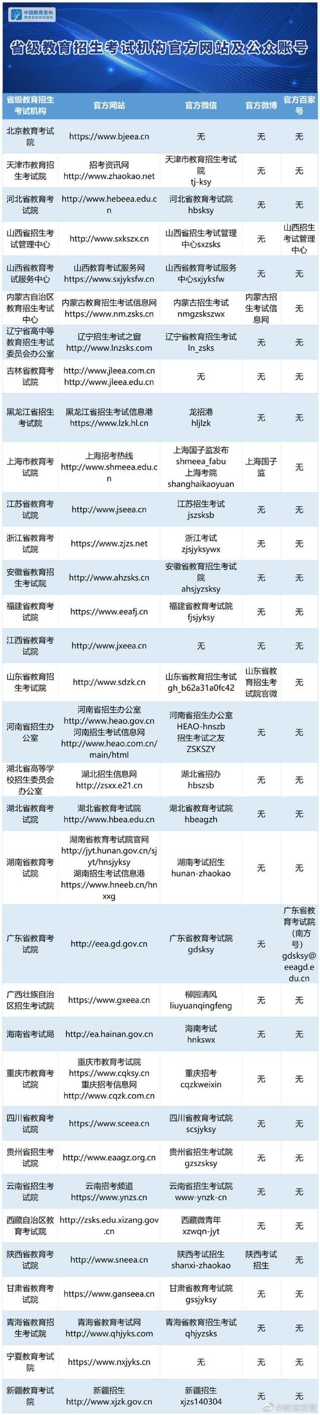 根据教育部“2021高考护航行动”安排,近日,教育部会同相关单位启动实施了“点亮权威考试招生机构官网标识”专项行动,将各省级教育招生考试机构官方网站及其官方微信、微博等信息集中公布。