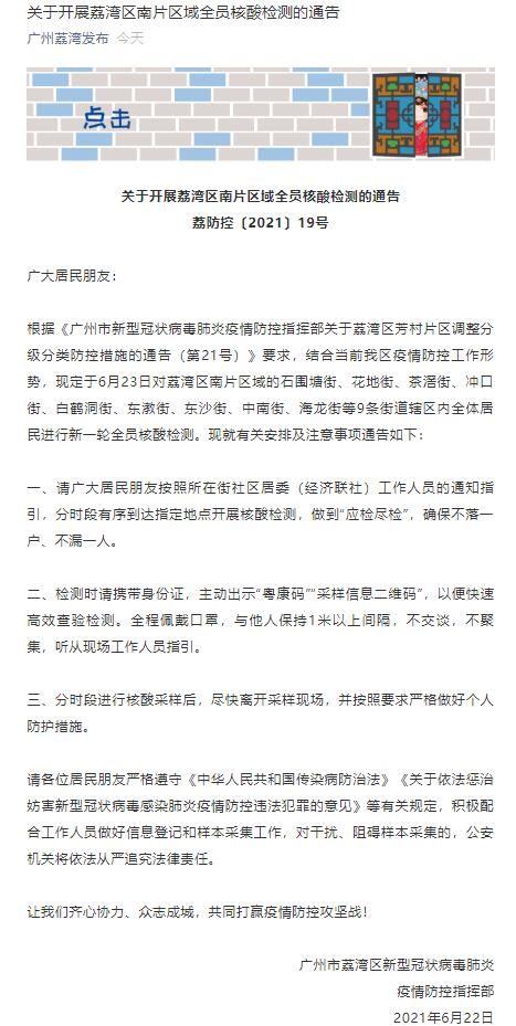 荔枝新闻讯 6月22日,广州市荔湾区发布通告称,结合当前疫情防控工作形势,现定于6月23日对荔湾区南片区域的石围塘街、花地街、茶滘街、冲口街、白鹤洞街、东漖街、东沙街、中南街、海龙街等9条街道辖区内全体居民进行新一轮全员核酸检测。