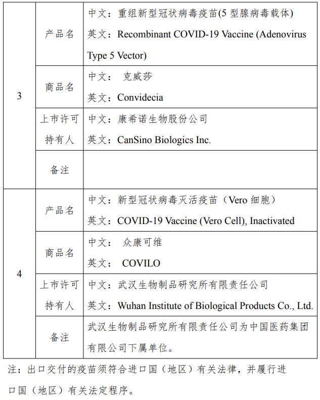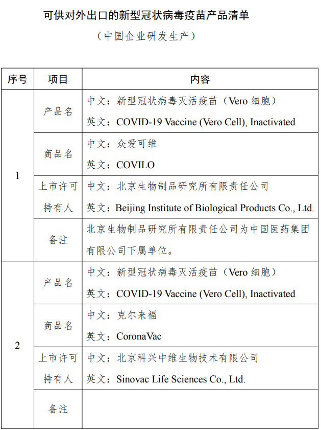 为做好新型冠状病毒疫苗出口工作,支持国际抗疫合作,现将经国家药品监督管理局批准或附条件批准上市注册申请的新型冠状病毒疫苗产品列入“可供对外出口的新型冠状病毒疫苗产品清单(中国企业研发生产)”。清单将根据国家药品监督管理局审批上市情况适时动态调整。