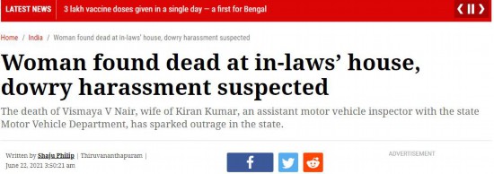 事情还要从21日说起。报道称,当天一早,她被发现吊死在其公婆家中的卫生间里。维斯马娅的死亡引发了外界关注。其所在邦的妇女委员会要求警方提供报告。据报道,警方已将这起案件登记为非正常死亡案件。
