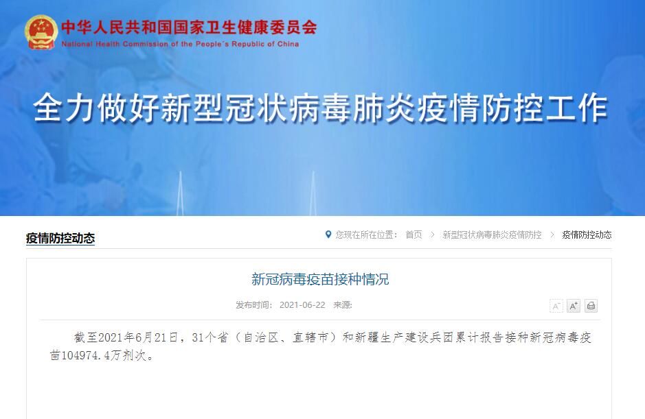 截至2021年6月21日,31个省(自治区、直辖市)和新疆生产建设兵团累计报告接种新冠病毒疫苗104974.4万剂次。