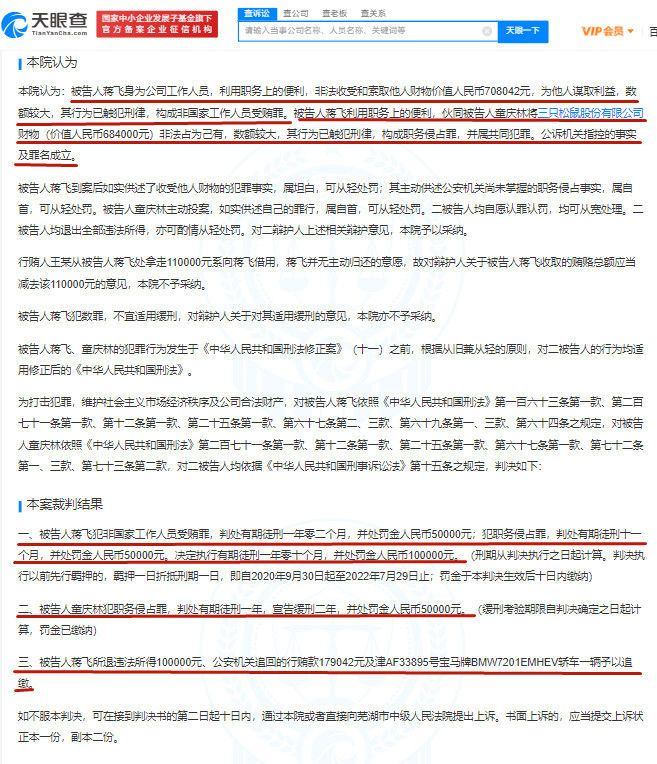 天眼查App显示,近日,蒋某、童某非国家工作人员受贿、职务侵占一审刑事判决书公开,案号(2021)皖0203刑初28号,审理法院为安徽省芜湖市弋江区人民法院。