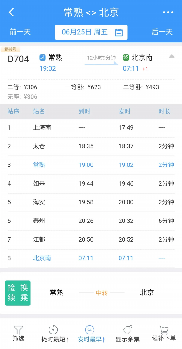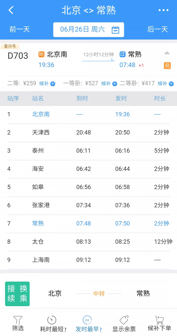 6月26日起发车,北京南-常熟D703次,历时约12时12分,19:36从北京南站发车,预计次日07:48抵达常熟站。二等硬座259元,一等、二等卧铺价格分别为527元、417元。