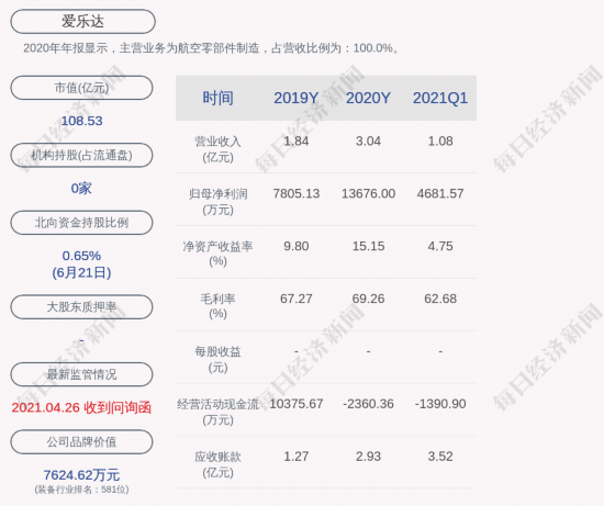 2020年年报显示,爱乐达的主营业务为航空零部件制造,占营收比例为:100.0%。