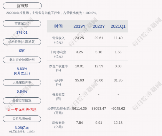 2020年年报显示,新宙邦的主营业务为化工行业,占营收比例为:100.0%。