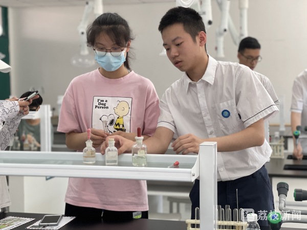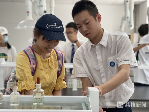 南京市鼓楼实验中学的张家赫穿着十三中校服,不久前,他入选十三中学科特长生,已经成为准十三中的高一学生。他说,对高中课程很感兴趣,尤其对化学实验印象深刻,在志愿者和老师的指导下,他完成了“瞬间速‘冻’”实验。“初中实验做得不是很多,这里这么多实验,我觉得很不错,也很期待高中生活。”