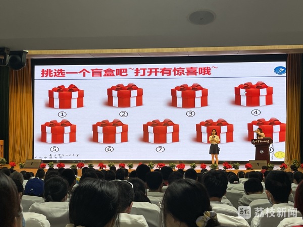 在十三中新青年剧场,大屏上九个盲盒“装”着不同内容,台下学生们任意挑选数字,台上主持人现场回答。从社团活动、食堂美食,从夕阳西下时如“龙猫”造型的树影,到自习课上可爱的“十三中学术猫”,总有一个点让你记忆深刻。