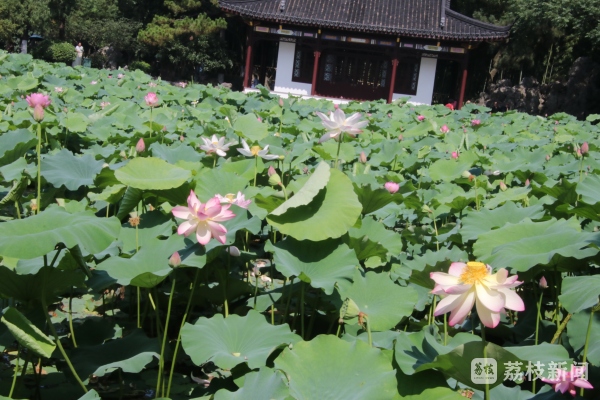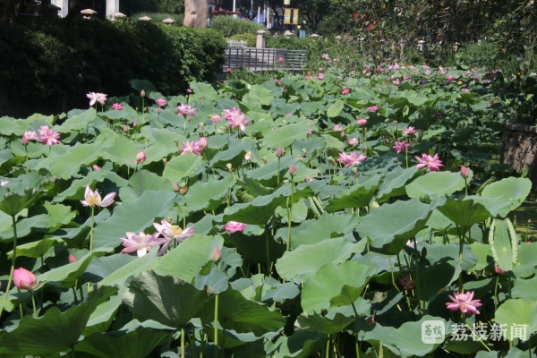 21日夏至,也是南京一年中最热的季节,随气温升高,渐入莫愁湖赏荷佳期。夏天去莫愁湖赏荷花一直是南京人的一大传统,22日上午,我们在景区看到,目前公园内的荷花已经盛开了,各色荷花开得娇艳欲滴,偶尔一阵微风吹过,莲叶微微颤动,如凝碧的波痕,也如名家的水墨,一笔一笔组成了一幅巨大的夏日荷塘美景图。