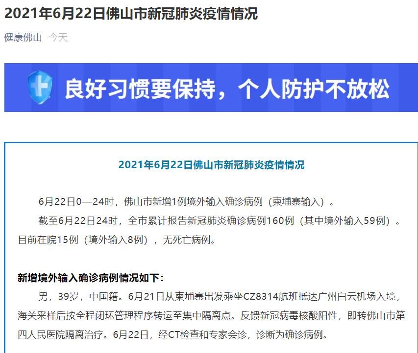 6月22日0—24时,佛山市新增1例境外输入确诊病例(柬埔寨输入)。