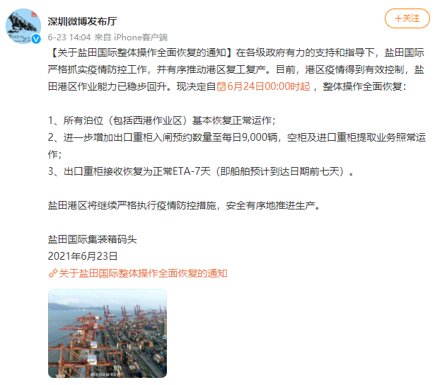 荔枝新闻讯 深圳微博发布厅发布《关于盐田国际整体操作全面恢复的通知》。通知如下: