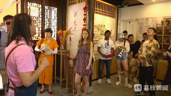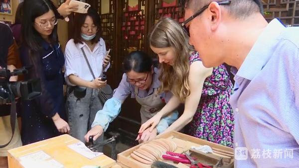 在青果巷历史文化街区里,常州梳篦第九代传承人邢粮,正在给外籍友人介绍这项非遗的历史与典故,这批近20人,分别来自英国、意大利、波兰等国家的外籍友人在得知这是项传承了1500年的传统艺术后,大家纷纷开始了制作学习。