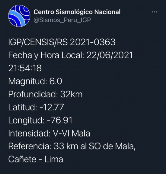 根据秘鲁地球物理研究所报告,地震发生于当地时间22日21时54分,震中位于利马大区卡涅特省的马拉区,震源深度32千米。据当地媒体报道,秘鲁全国多地都有强烈震感。