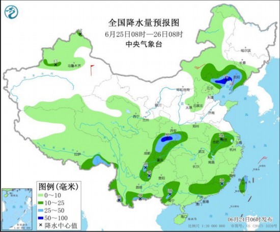 6月25日8时至26日8时,内蒙古东南部、东北地区南部、河北北部、陕西南部、四川盆地东部、江淮大部、云南南部和西部、华南北部、新疆伊犁河谷、台湾岛等地部分地区有中到大雨,局地有暴雨。内蒙古中部等地部分地区有4~6级风,新疆东部部分地区有7~8级风。