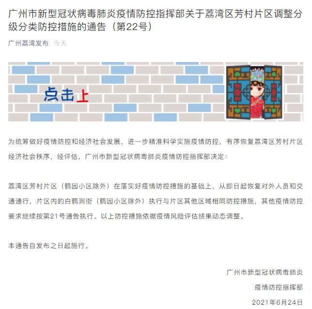 荔湾区芳村片区(鹤园小区除外)在落实好疫情防控措施的基础上,从即日起恢复对外人员和交通通行,片区内的白鹤洞街(鹤园小区除外)执行与片区其他区域相同防控措施,其他疫情防控要求继续按第21号通告执行。以上防控措施依据疫情风险评估结果动态调整。