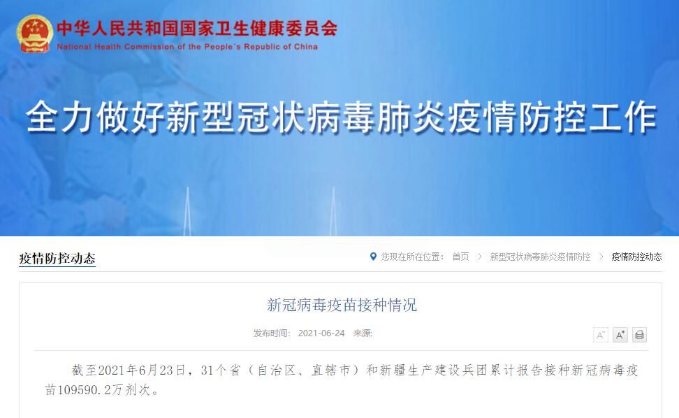 国家卫健委网站消息,截至2021年6月23日,31个省(自治区、直辖市)和新疆生产建设兵团累计报告接种新冠病毒疫苗109590.2万剂次。
