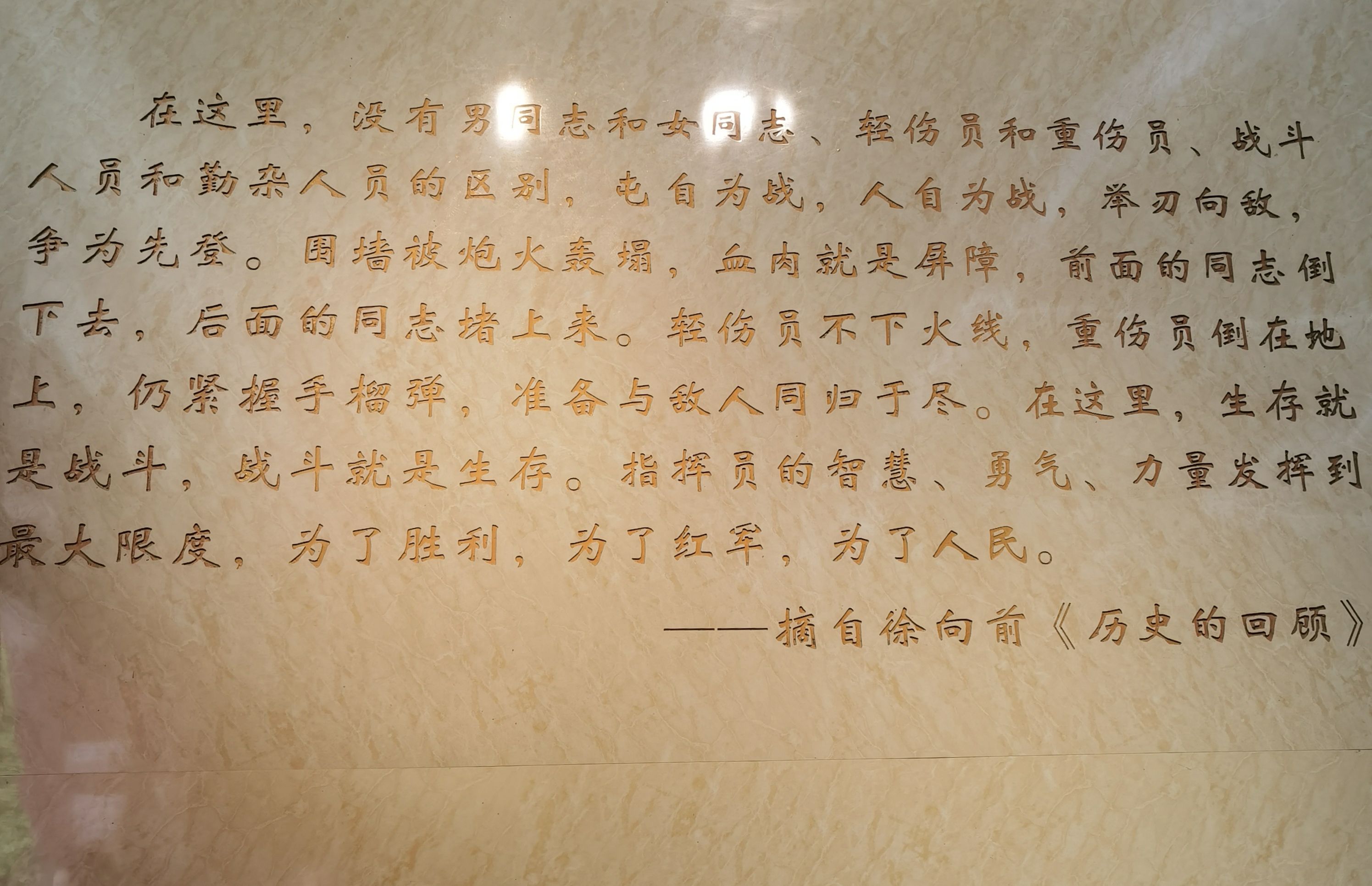 徐向前在《历史的回顾》中的几句话,深刻地记录了这段烽火记忆:“在这里,没有男同志和女同志、轻伤员和重伤员、战斗人员和勤杂人员的区别,屯自为战,人自为战,举刃向敌,争为先登。围墙被炮火轰塌,血肉就是屏障,前面的同志倒下去,后面的同志堵上来。轻伤员不下火线,重伤员倒在地上,仍紧握手榴弹,准备与敌人同归于尽。在这里,生存就是战斗,战斗就是生存。指战员的智慧、勇气、力量发挥到最大限度,为了胜利,为了红军,为了人民。”