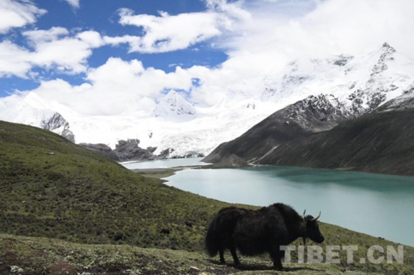 图为萨普冰川脚下,牦牛在湖边悠然自在 摄影:索南多杰