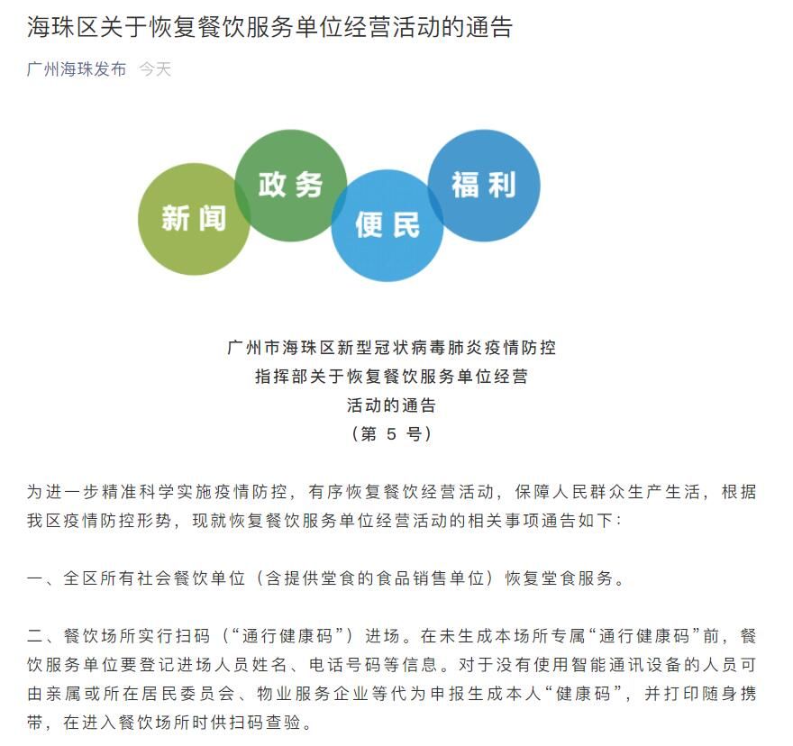荔枝新闻讯 广州市海珠区融媒体中心微信公众号“广州海珠发布”今日发布海珠区关于恢复餐饮服务单位经营活动的通告,称海珠区全区所有社会餐饮单位(含提供堂食的食品销售单位)恢复堂食服务。全文如下: