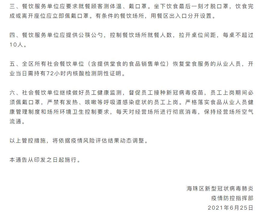 五、全区所有社会餐饮单位(含提供堂食的食品销售单位)恢复堂食服务的从业人员,开业当日需持有72小时内核酸检测阴性证明。