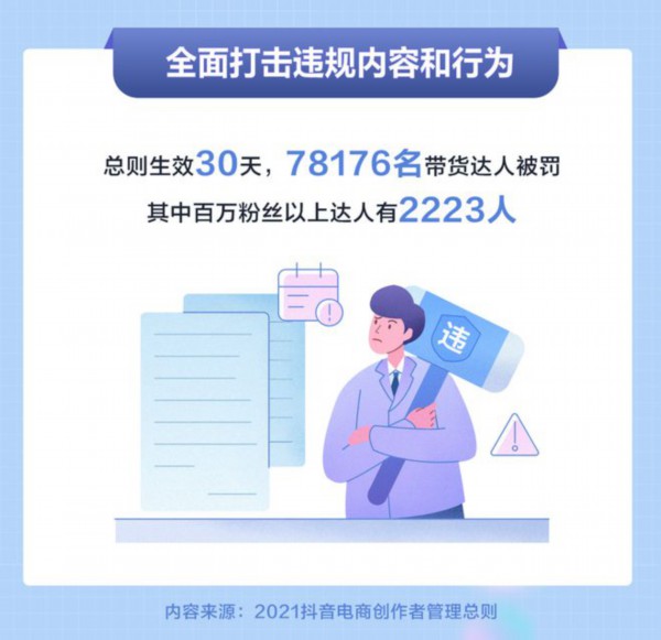 6月25日消息,抖音电商公布《电商创作者管理总则》(下称总则)阶段治理成果,有78176名带货达人因违规被平台判罚,其中百万粉丝以上的达人有2223人。