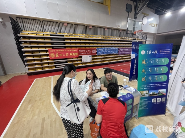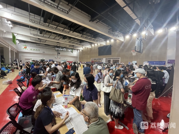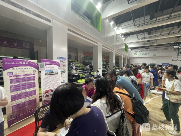 在南京第九中学震旦校区体育馆,近60所院校招生老师接受考生和家长的咨询。杨同学高考历史等科目类排名3700多名,打算填报南京师范大学和苏州大学。“问问我心仪的学校能不能冲一冲,看看有没有我不太了解的学校,看下偏理工的院校有没有适合的专业。”