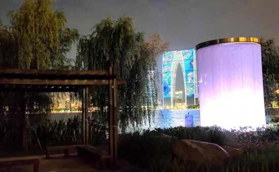 “风的色彩”灯光雕塑位于金鸡湖大桥东、现代大道南,高5米、直径3.5米,由多层垂挂的金属网与LED灯具组装而成,借助风速传感器和灯光控制系统,运用色彩变换表现风力大小。云淡风轻时,乳白色的金属织网安放在湖边一角;清风浮动时,内嵌的LED灯具感受到风力的变化,风速越快色彩越艳丽,营造出五彩斑斓的灯光氛围。