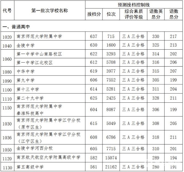 图:2020年南京第一批次部分高中阶段学校预测投档线(部分)
