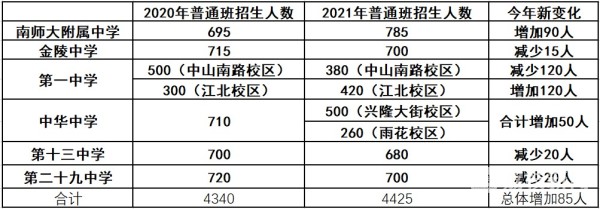 根据2021年《南京市中考指南》,今年南师附中、金陵中学、南京一中、中华中学、二十九中、十三中六所高中普通班招生合计4425人,比2020年增加85人,但真正意义上招生规模增加的是南师附中,普通班增加90人。