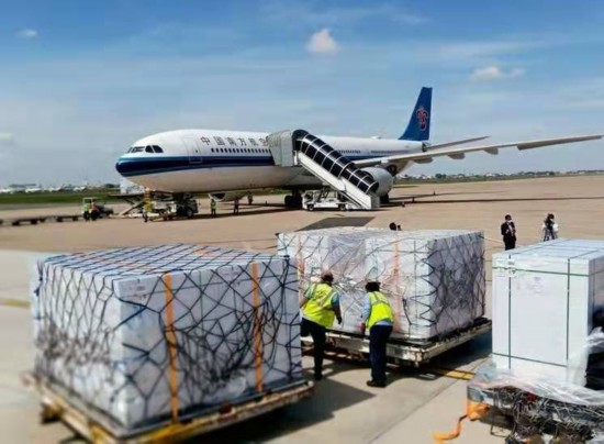 6月26日上午,新一批100万剂中国科兴新冠疫苗运抵金边国际机场。柬卫生部国务秘书如松班、财经部国务秘书翁塞维索前往机场迎接。