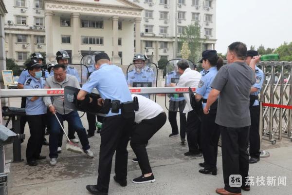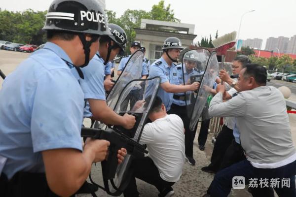 演练正式开始。警情显示:一名执行案件当事人鼓动亲友来院非法信访,围堵大门,影响办公秩序。执勤法警及时向大队领导报告后,法警大队立即启动应急预案,全体法警分成教育疏导与联络组、应急处置实施组、安全警戒组,按照平时训练要求携带相关警务装备立刻赶到现场,在劝导无效后,应急处置实施组干警采取临时强制性约束措施,将手中的盾牌紧密地筑成一道坚固的铜墙,把不法分子拦堵在了门外,最终将挑头闹事人员控制,圆满完成了这次突发事件应急处置演练。