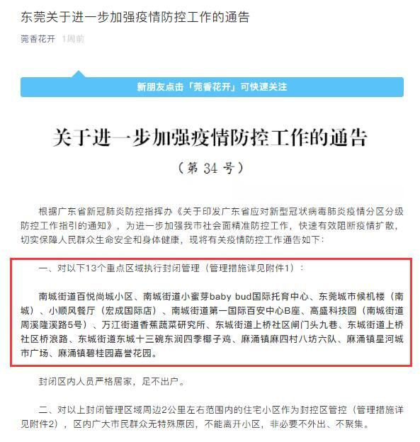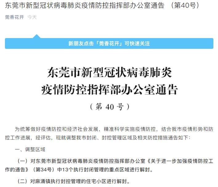 (一)对东莞市新型冠状病毒肺炎疫情防控指挥部办公室《关于进一步加强疫情防控工作的通告》(第34号)中13个执行封闭管理的重点区域进行解封。