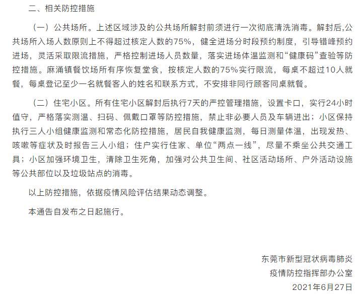 (一)公共场所。上述区域涉及的公共场所解封前须进行一次彻底清洗消毒。解封后,公共场所入场人数原则上不得超过核定人数的75%,健全进场分时段预约制度,引导错峰预约进场,灵活采取限流措施,严格控制进场人员数量,落实进场体温监测和“健康码”查验等防控措施。麻涌镇餐饮场所有序恢复堂食,按核定人数的75%实行限流,每桌不超过10人就餐,每桌登记至少一名就餐客人的姓名和联系方式,不安排非同行顾客同桌就餐。