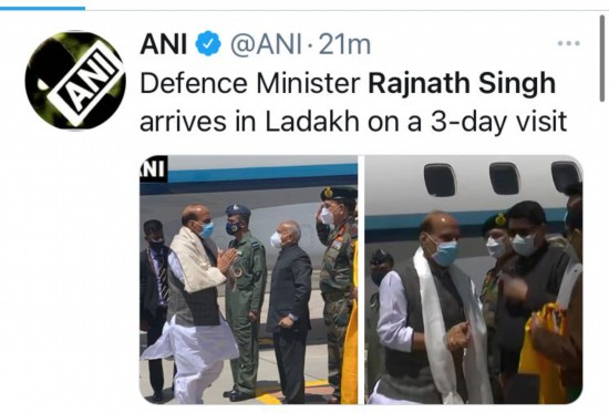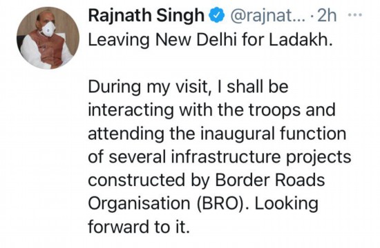 “正离开新德里,前往‘拉达克’。访问期间,我将与部队沟通,并参加边境道路组织(BRO)建设的几个基础设施项目的落成典礼。对此我已迫不及待。” 辛格在推特上写道。