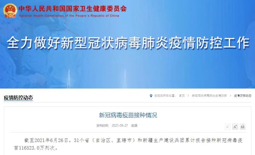 国家卫健委网站6月27日消息,截至2021年6月26日,31个省(自治区、直辖市)和新疆生产建设兵团累计报告接种新冠病毒疫苗116523.0万剂次。