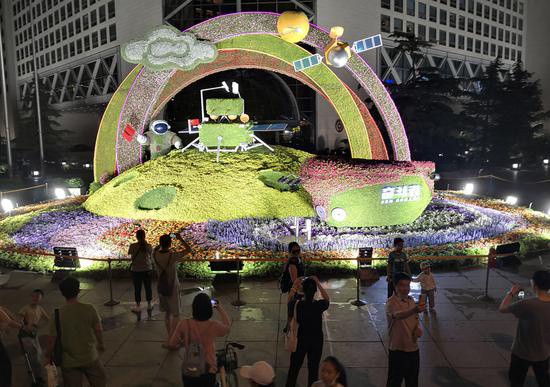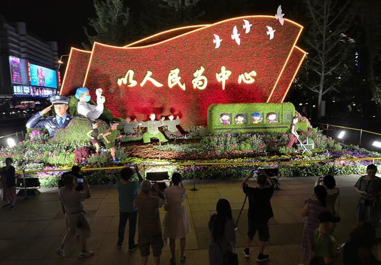 在荷花市场广场,不少市民在主题花坛前驻足,用手机与“红船”合影留念。“南湖红船的景观布置寓意好,晚上还有雾化效果,感觉就像坐在船上。”一位正在拍照的附近居民说。