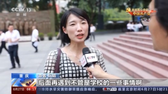 游客 阮娟:我2002年入党,到现在那就是19年,我当时加入中国共产党的初心是因为在学校里面,党员是一个优秀的标志,所以大家都积极地争取去入党。那是大学阶段入的党,后面再遇到不管是学校的一些事情,或者遇到一些困难的时候,可能大家会很自觉地形成一种党员先上的风气,而且这种风气会相互地感染。然后走上工作岗位以后,我觉得说,现在特别是这几年,你会发现我们的人民,大家对我们的政府对我们党的认可度都在提升,我也觉得由衷地感到骄傲吧。