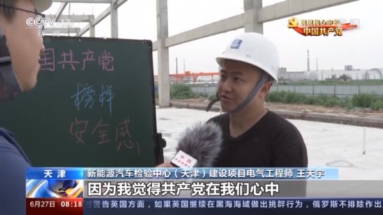 新能源汽车检验中心(天津)建设项目电气工程师 王天宇:我觉得共产党在我们心中有榜样的力量。首先我的父亲也是一个共产党员,他在我心中也是一个榜样,因为当时疫情暴发的时候他就去当志愿者。后来镇政府还给我们家发了一个抗疫先进家庭的荣誉,我感觉这个事儿也是非常好的。