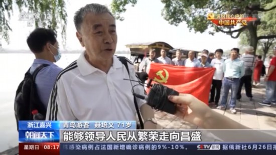 青岛游客 聂培义(71岁):我们的党领导中国人民走到100年,走到这一步很不容易。世界上只有中国共产党,能够带领人民从繁荣走向昌盛。