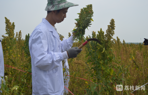 在位于盐城的省农科院沿海现代农业科技创新示范基地藜麦丰产示范方,农业科研人员在随机选取的测产点,有条不紊地收割着已经成熟的藜麦。