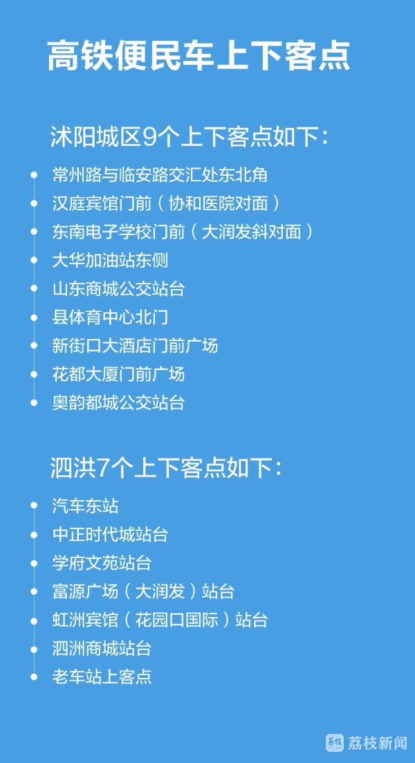 在价格上,沭阳试运行班车票价,其中宿迁高铁便民车票价20元/人,淮安高铁便民车票价24元/人,泗阳高铁便民车票价19元/人。